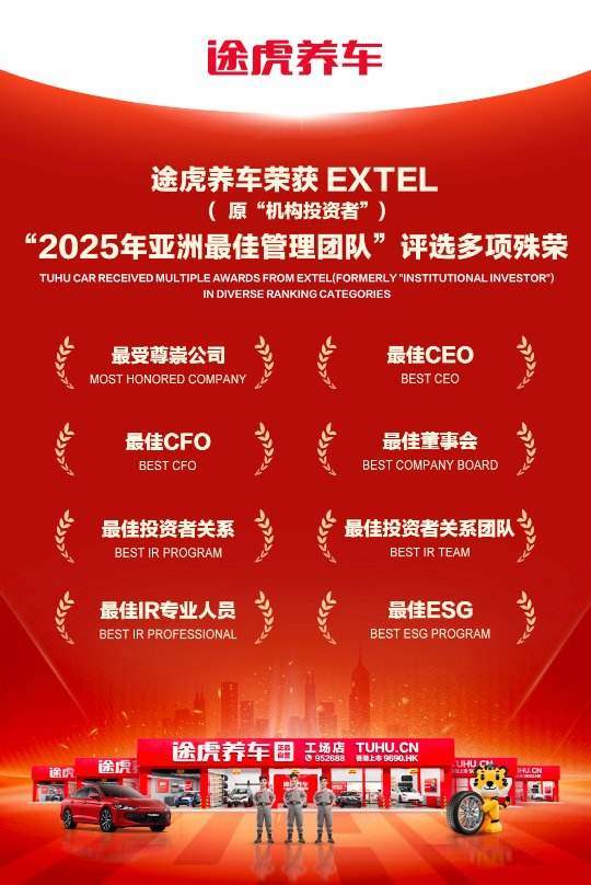 近日,国际权威金融调研机构Extel(前《机构投资者》)公布“2025年度亚洲最佳管理团队”评选结果。途虎养车(股份代码:9690.HK)凭借创新的商业模式、卓越的公司治理、透明的投资者关系及领先的ESG实践,在评选中脱颖而出,荣膺汽车与汽车零部件(Autos & Auto Parts)行业最受尊崇公司(行业前三席位)等8项殊荣。
