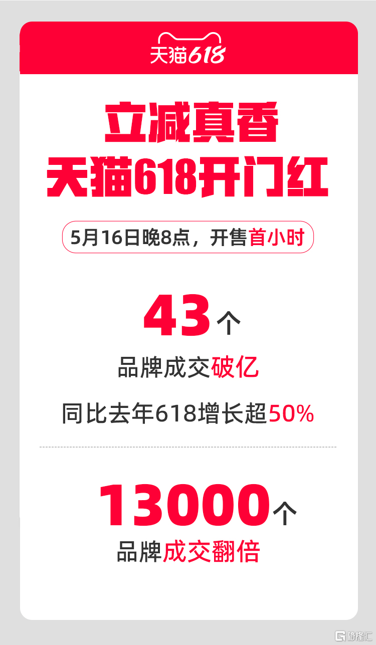 文章版权声明:除非注明,否则均为立减真香!天猫618 开门红:首小时43个品牌成交破亿 同比增长超50%原创文章,转载或复制请以超链接形式并注明出处。