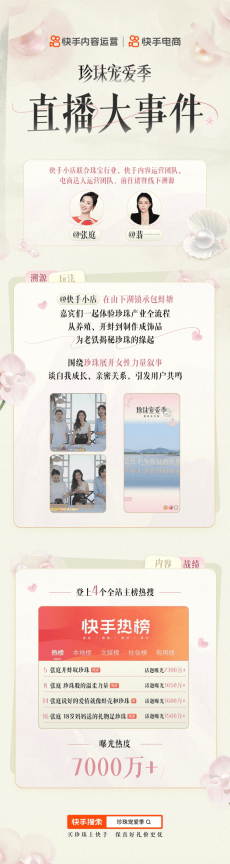 为了带更多消费者清晰地了解珍珠来源,进而赢得信任、促进转化,5月14日,快手小店联合珠宝玉石行业,携手@张庭、@翡一一 前往浙江诸暨山下湖镇开启直播,探索一颗珍珠从孕育、采收到设计、加工的全流程。