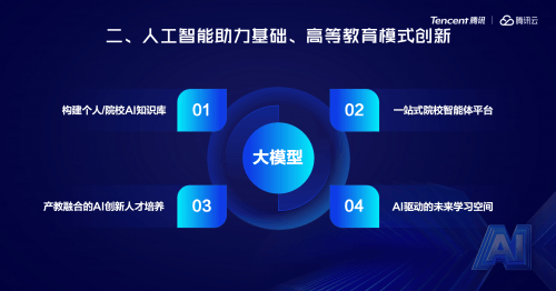 面向基础教育及高等教育,腾讯不断加码在算力设施、基础模型、工具平台和应用服务的体系化布局,与学校开展多元合作,借助大模型全栈能力,助力打造知识库、智能体平台、加速创新人才培养,打造AI驱动的未来学习空间。