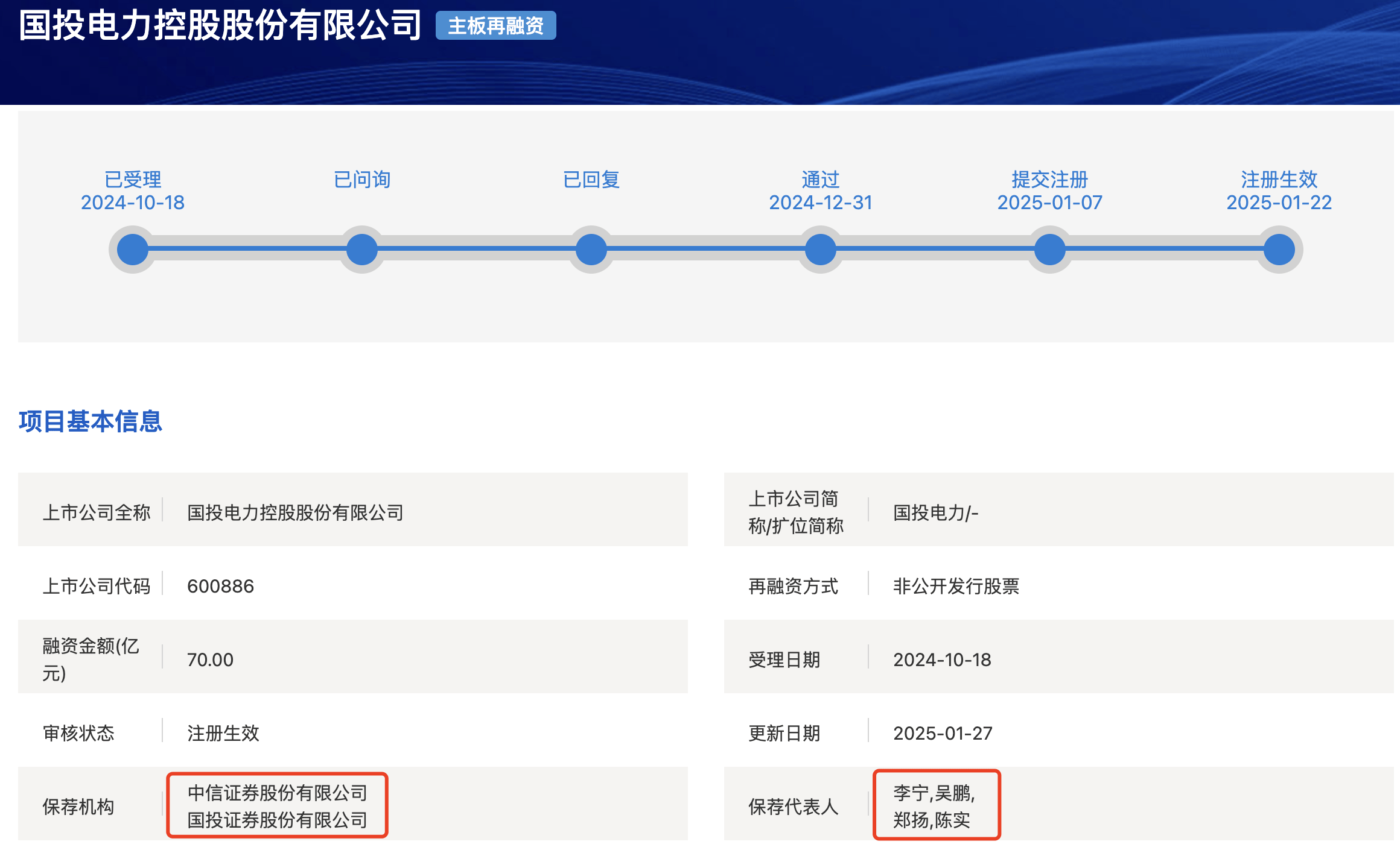 值得一提的是,记者进一步发现,本次上交所“点名”的中信证券保代李宁、吴鹏,国投证券保代郑扬、陈实,都曾共同完成了一个项目――国投电力非公开发行股票项目。根据上交所披露,该项目于2024年10月18日获受理,没有经过问询回复,于2024年12月31日通过。