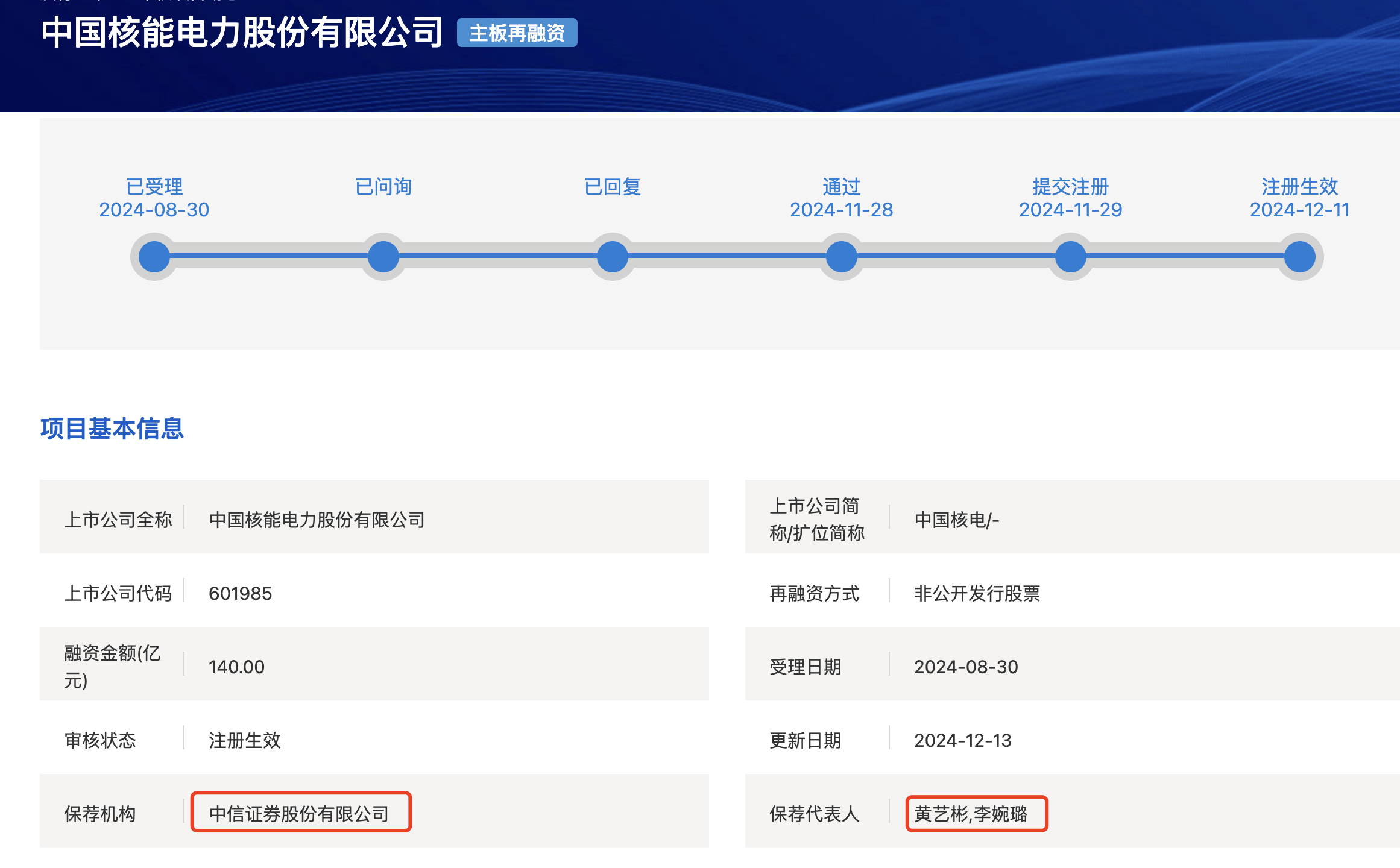 而此次中信证券被“点名”的另外2名保代黄艺彬、李婉璐曾完成了中国核电非公开发行股票项目。根据上交所披露,该项目于2024年8月30日获受理,同样未经问询回复,于2024年11月28日通过。