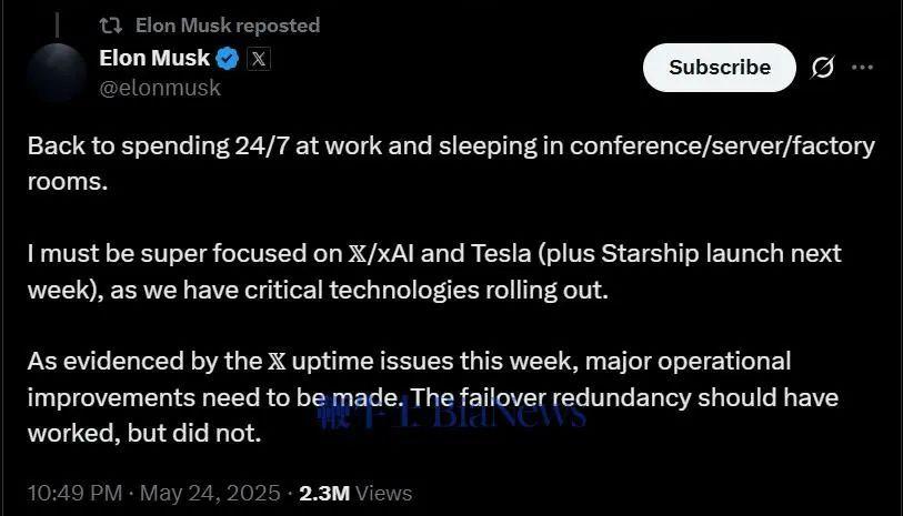马斯克5月24日在社交媒体上发帖称,他已经重新回到7x24小时工作的状态,还要“睡在会议室、服务器机房或工厂里”。马斯克表态称:“我必须全神贯注于X/xAI和特斯拉。”