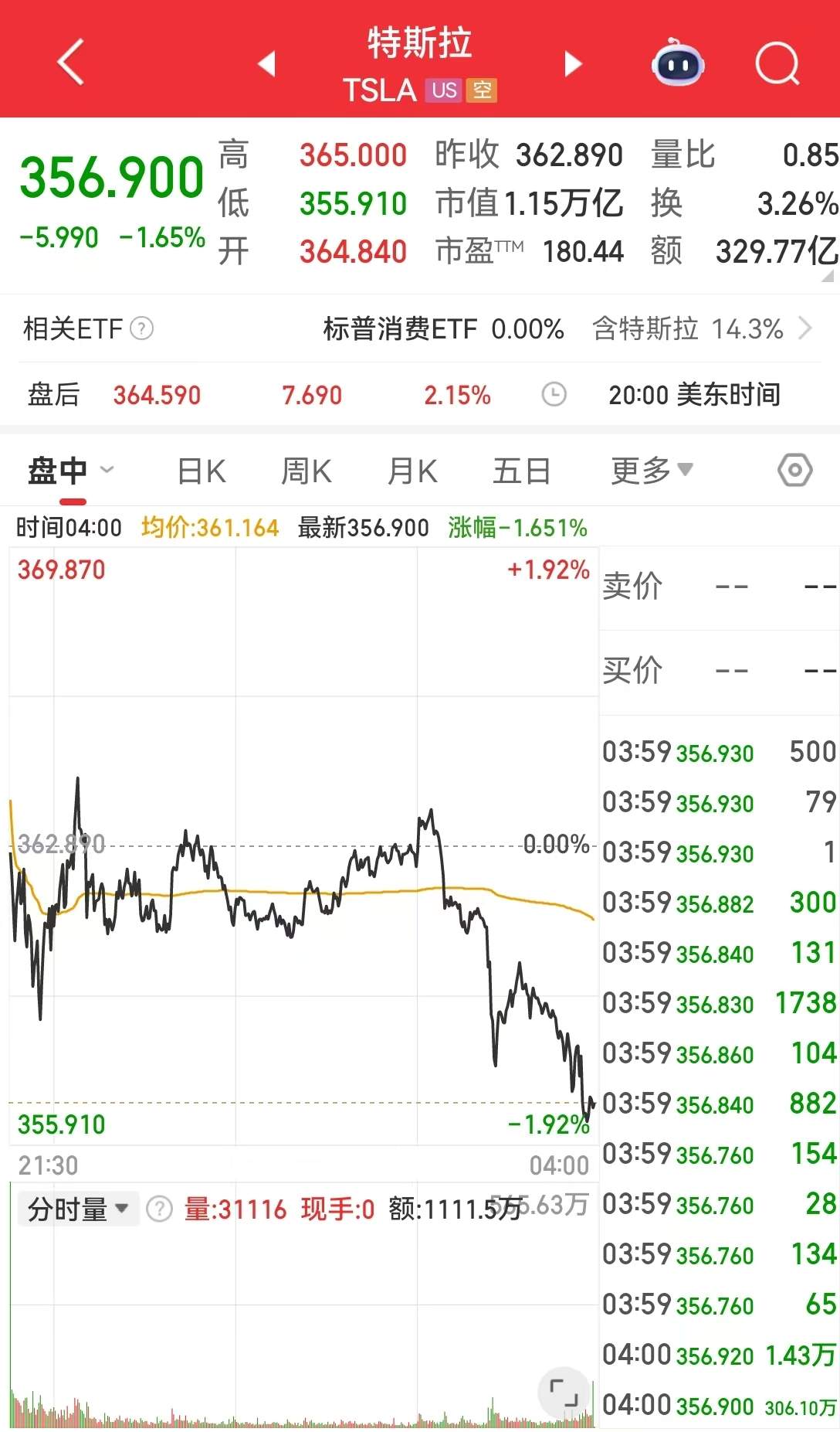 截至当地时间5月28日美股收盘,特斯拉报356.9美元,跌幅1.65%,市值1.15万亿美元。