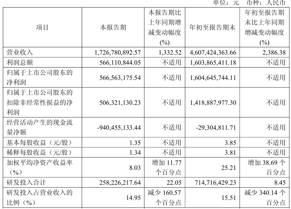 寒武纪(688256.SH)发布2025年三季报,前三季度营收为46.07亿元,同比增长2386.38%;净利润为16.05亿元。其中,第三季度营业收入17.27亿元,同比增加1332.52%,净利润为5.66亿元。