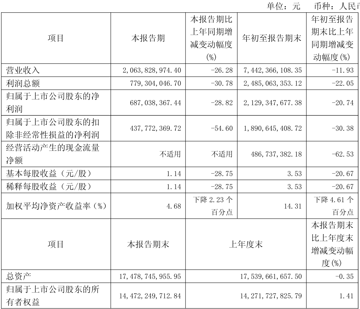 片仔癀(600436.SH)发布2025年第三季度报告,公司第三季度营业收入为20.64亿元,同比下降26.28%,归属于上市公司股东的净利润为6.87亿元,同比下降28.82%。年初至报告期末,公司营业收入为74.42亿元,同比下降11.93%,归属于上市公司股东的净利润为21.29亿元,同比下降20.74%。业绩变动主要原因是年初至报告期末医药制造业销售减少、毛利率下降。