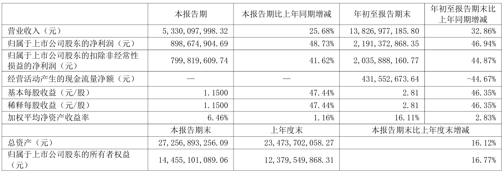 思源电气(002028.SZ)发布2025年第三季度报告。2025前三季度,公司营业收入138.27亿元,相较上年同比增32.86%;归属于上市公司股东的净利润21.91亿元,同比增46.94%;归属于上市公司股东的扣除非经常性损益的净利润20.36亿元,同比增44.87%。