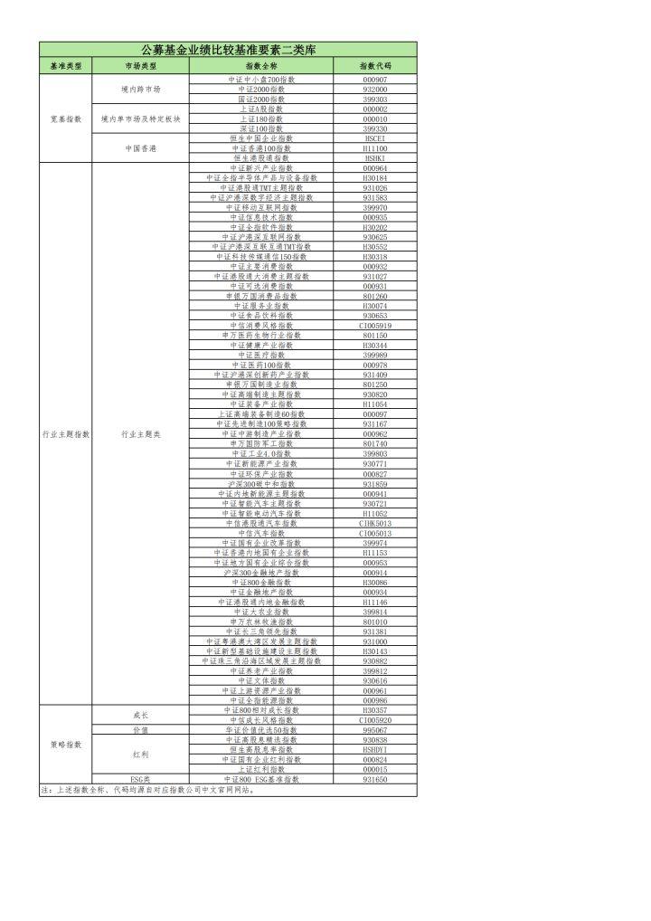 公募基金业绩比较基准要素库名单显示,一类库共有69只指数,二类库有72只(名单附在最后)。