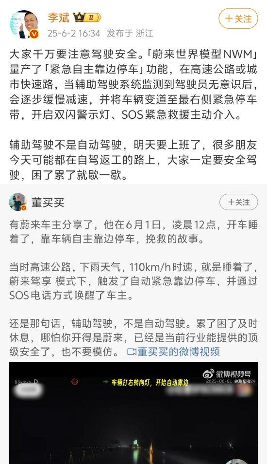 新浪科技讯 6月2日下午消息,在社交媒体上,有蔚来车主分享他在6月1日,凌晨12点,开车睡着了,靠车辆自主靠边停车,挽救自己的故事。
