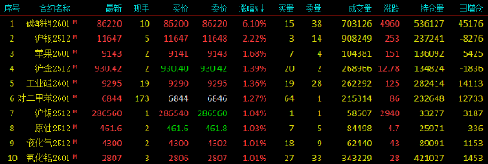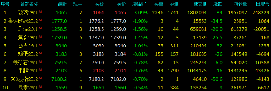 2025年11月10日,早盘收盘,国内期货主力合约涨跌互现。碳酸锂涨超6%,沪银涨超2%,苹果、沪金、工业硅、PX涨超1%;跌幅方面,玻璃跌超3%,集运欧线跌近2%,焦煤、焦炭、沥青跌超1%。