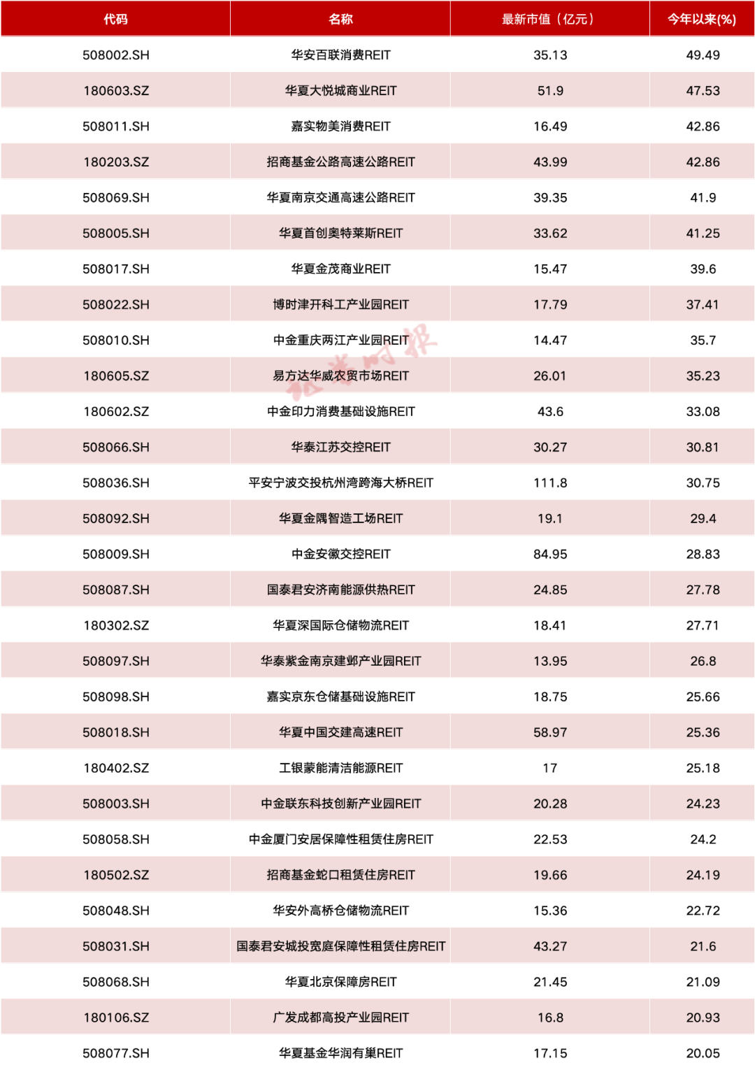 分单个产品来看,华安百联消费REIT、华夏大悦城(000031)商业REIT等6只产品年内累计涨幅超过40%。