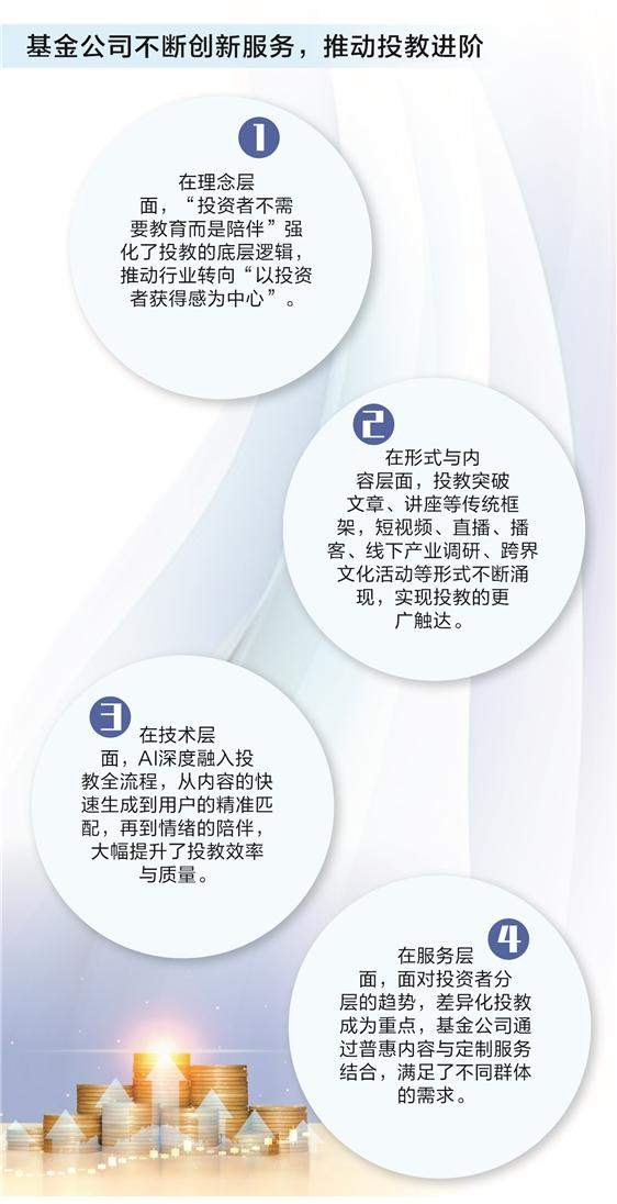 今年5月发布的《推动公募基金高质量发展行动方案》进一步明确,要求基金公司践行“长期投资”理念,通过多维度举措持续提升投资者获得感。这一系列转变正倒逼基金投教摆脱过去“追逐短期热点”“形式大于内容”的传统路径,转向“深耕长期投资理念培育”“聚焦投资者获得感提升”的新发展方向――其核心逻辑已从单向教育转向陪伴式服务,强调以投资者为中心的长期陪伴而非简单的知识灌输。