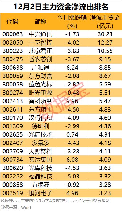 3股主力资金净流出金额逾10亿元,其中通信龙头股中兴通讯(000063)主力资金净流出30.23亿元,居首,净流出额创2020年3月16日以来新高。