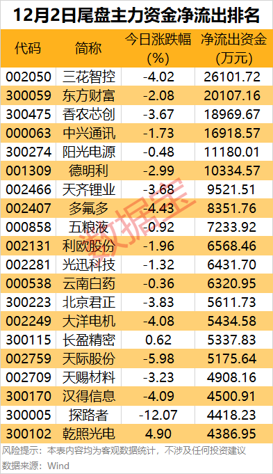 据数据宝统计,16股尾盘主力资金净流出金额均超5000万元,其中6股尾盘净流出均超1亿元。三花智控(002050)和东方财富(300059)尾盘主力资金净流出均超2亿元,居前。