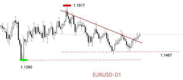 技术角度看,日线级别,EURUSD处于高位横盘震荡状态,震荡上限在1.1917点,下限在1.1390点。11月26日的阳K线,与图中的下降趋势线交叉,反弹走势有加速迹象。截至目前,已经有连续五根K线的收盘价处于下降趋势线上方,形成有效突破结构。考虑到EURUSD在前一轮走势中保持震荡区间内顶部到底部的运行,本次反弹走势可能遵循底部到顶部的震荡区间运行,中期目标或在前期高点1.1917附近。