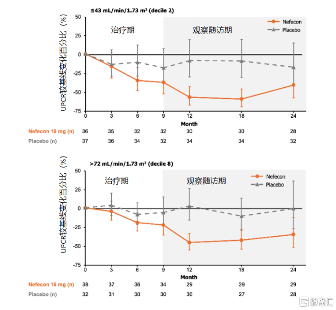 NefIgArd研究子分析通过细致的分组发现,无论患者的基线eGFR水平如何,耐赋康均能显著减少基线尿蛋白肌酐比水平(UPCR),并在所有时间点显示出对eGFR的保护作用。这一发现打破了传统治疗对于肾功能阈值的限制,为临床治疗提供了更广泛的适用范围。