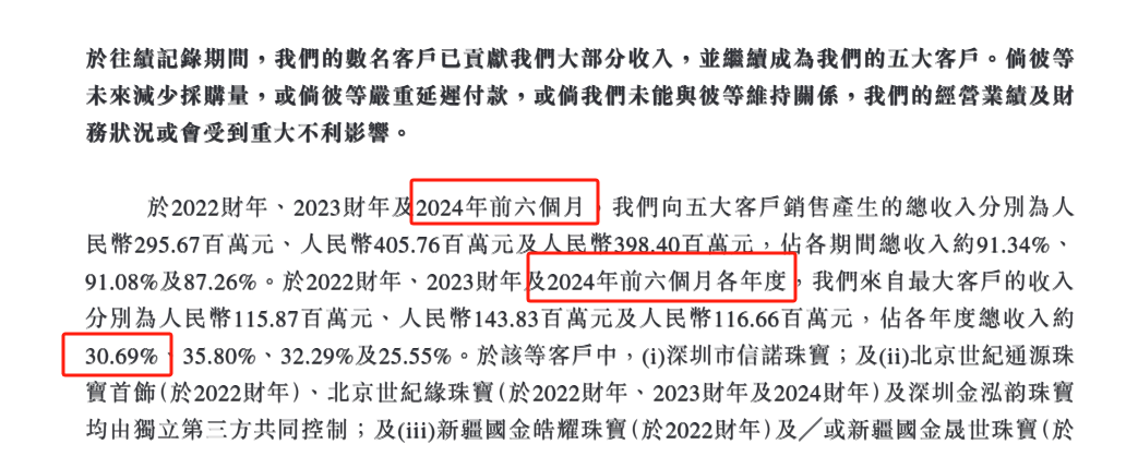 业绩承压的背后,西普尼的大客户“依赖症”较为严重,各报告期向5大客户的销售额为2.96亿元、4.06亿元及3.98亿元,分别占总收入的91.34%、91.08%及87.26%;来自最大客户的收入分别为1.16亿元、1.44亿元及1.17亿元,占各年度总收入约30.69%、35.80%及25.55%。其中,世纪缘珠宝、深圳市信诺珠宝、新疆国金晟世珠宝连续三年进入西普尼的五大客户名单,且均为OBM业务模式下的一级经销商。