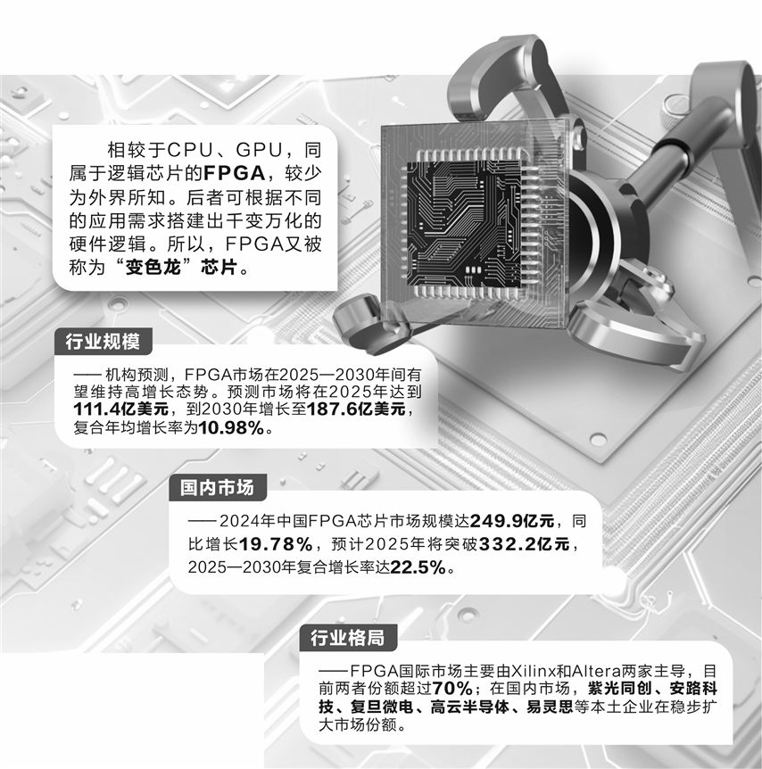 国内市场前景更为显著。据中研普华报告的预测,2024年中国FPGA芯片市场规模达249.9亿元人民币,同比增长19.78%,预计2025年将突破332.2亿元人民币,2025―2030年复合年均增长率为22.5%。