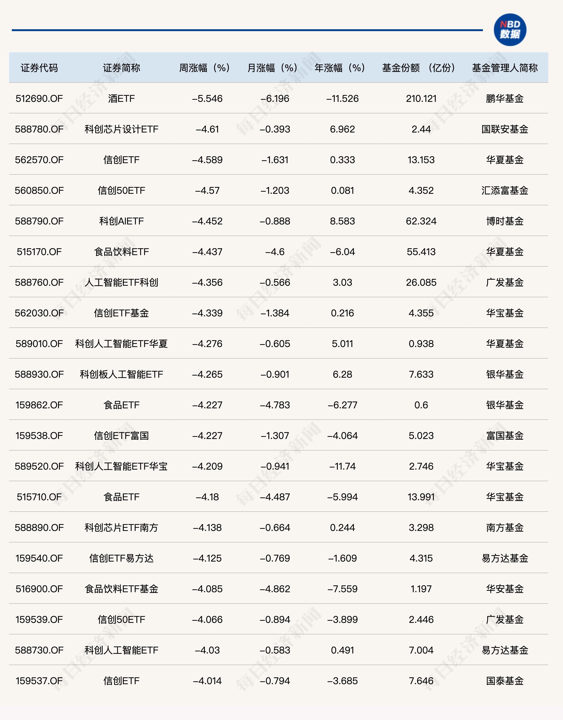 跌幅榜:酒类指数已连跌5年,酒ETF本周跌超5%