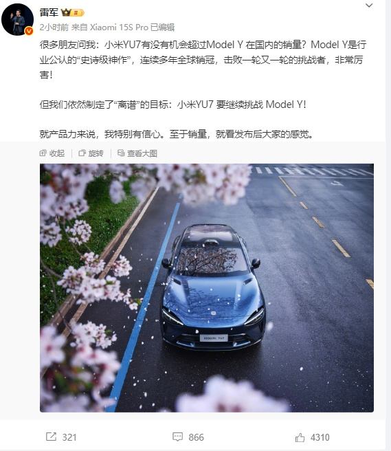 文章版权声明:除非注明,否则均为雷军回应小米YU7销量!目标挑战特斯拉Model Y原创文章,转载或复制请以超链接形式并注明出处。