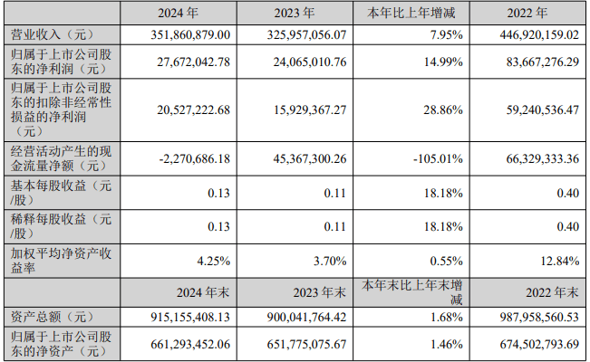 2024年,公司实现营业收入3.52亿元,同比增长7.95%;归属于上市公司股东的净利润2767.20万元,同比增长14.99%;归属于上市公司股东的扣除非经常性损益的净利润2052.72万元,同比增长28.86%;经营活动产生的现金流量净额-227.07万元。