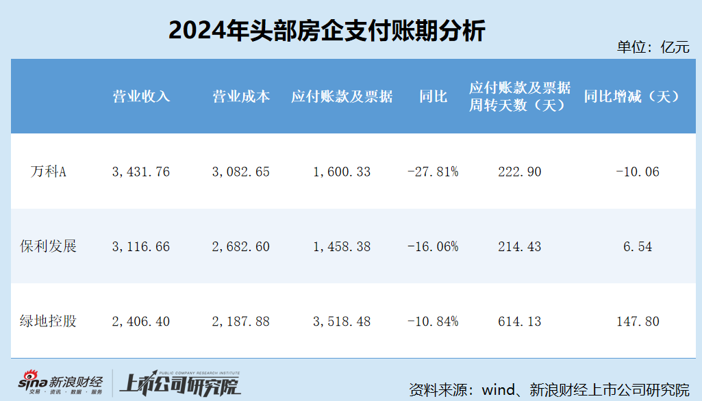 单就3家头部房企而言,万科A、保利发展的支付账期较接近,2024年分别为223天、214天,低于行业平均280天的账期。而绿地控股的支付账期却长达614天,几乎是万科A、保利发展的3倍。