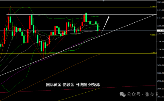 日图;金价近日连续回落走低,虽跌至中轨及30日等均线下方,但目前受到60日均线附近支撑有所止跌反弹,并且也临近今年以来的上升趋势线支撑,所以,在跌破支撑收线之前,仍可先看反弹,等待再度上探3430或3500美元,如跌破支撑,将有望进一步触及100日均线支撑3160美元附近,再看反弹(横向支撑和双底)。