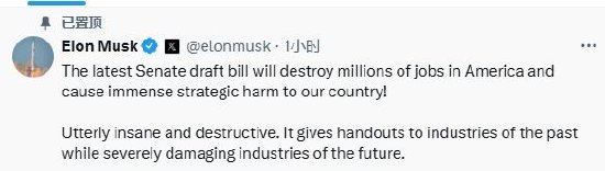 马斯克于当地时间29日在X平台上写道,“最新的参议院草案将摧毁美国数百万个就业岗位,并对我们国家造成巨大的战略损害!”