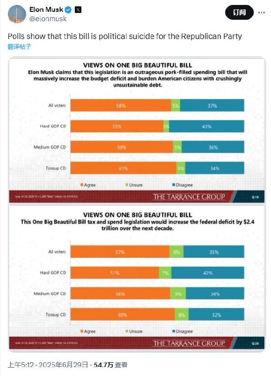 随后,他引用了塔兰斯集团(THE TARRANCE GROUP)的民调结果,并配文字:“民意调查显示,这项法案对共和党而言是政治自杀行为。”