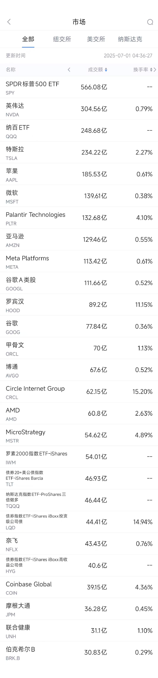 6月30日美股成交额前20:市场预期特斯拉交付数据持续下滑