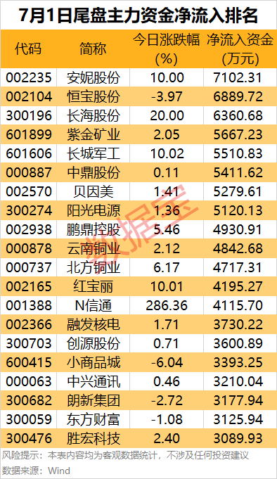 还有恒宝股份(002104)、长海股份(300196)、紫金矿业(601899)、长城军工(601606)等个股尾盘获主力资金净流入居前,均超5000万元。