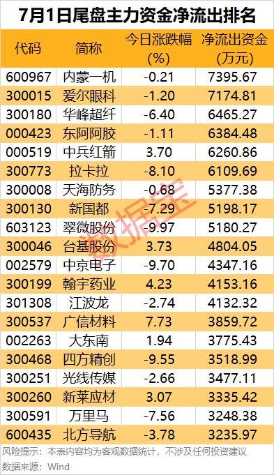 内蒙一机和爱尔眼科(300015)尾盘遭主力资金净流出居前,均超7000万元。此外,华峰超纤(300180)、东阿阿胶(000423)、中兵红箭(000519)、拉卡拉等个股尾盘遭主力资金净流出居前。