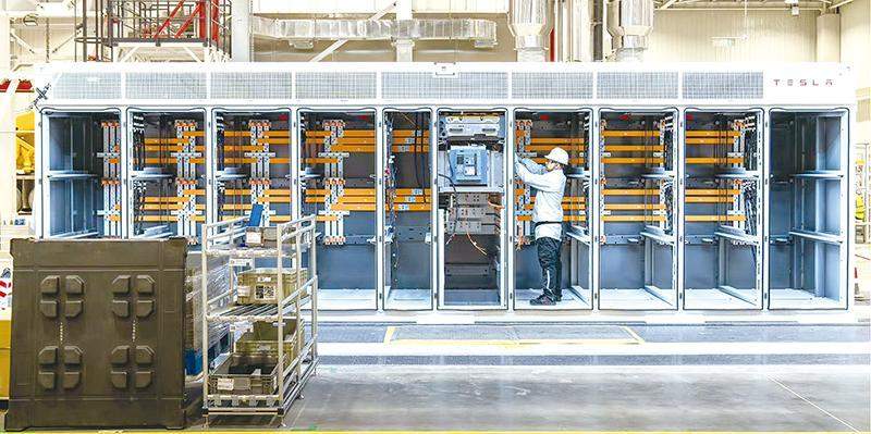 工人正在总装线上组装储能系统Megapack。(受访公司供图)