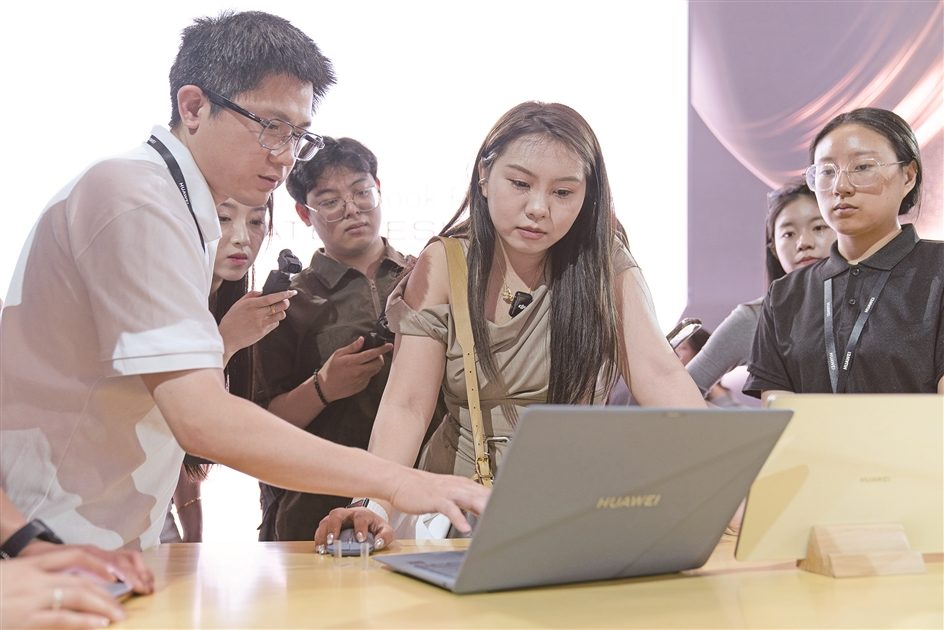 5月19日,消费者在发布会后体验鸿蒙电脑。当日,华为在成都正式发布两款鸿蒙电脑,这是鸿蒙操作系统首次在电脑端正式发布,在电脑操作系统领域迈出新步伐。据介绍,鸿蒙电脑研发上市历经五年,投入上万名研发人员,布局专利达2700多个,实现操作系统移动端与桌面端的生态统一。截至目前,鸿蒙电脑已实现与超1100款外设设备的互联互通,已有超150个专属电脑生态应用加速适配,上架融合应用数量从300余款攀升至1000余款,预计年底将支持超过2000个融合生态应用。新华社记者 胥冰洁/摄 (更多报道见A5版)