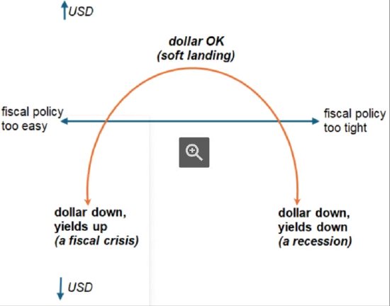 他补充道:“皱眉曲线右端是财政立场收紧得过快,虽然大幅缩减了赤字,但却迫使美国陷入衰退、美联储进入深度宽松周期。”中段则代表软着陆,对美元更为有利。