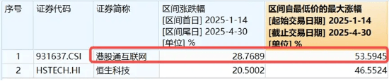 变局时刻,把握港股核心科网龙头。港股互联网ETF(513770)及其联接基金(A类017125;C类017126)被动跟踪中证港股通互联网指数,通过重仓港股互联网龙头,成为本轮港股科技行情的高效投资利器。数据显示,本轮行情启动以来至4月末,中证港股通互联网指数累计涨幅超28%,明显优于恒指、恒科指同期表现,区间最大涨幅更是高达53.59%,领涨弹性突出。