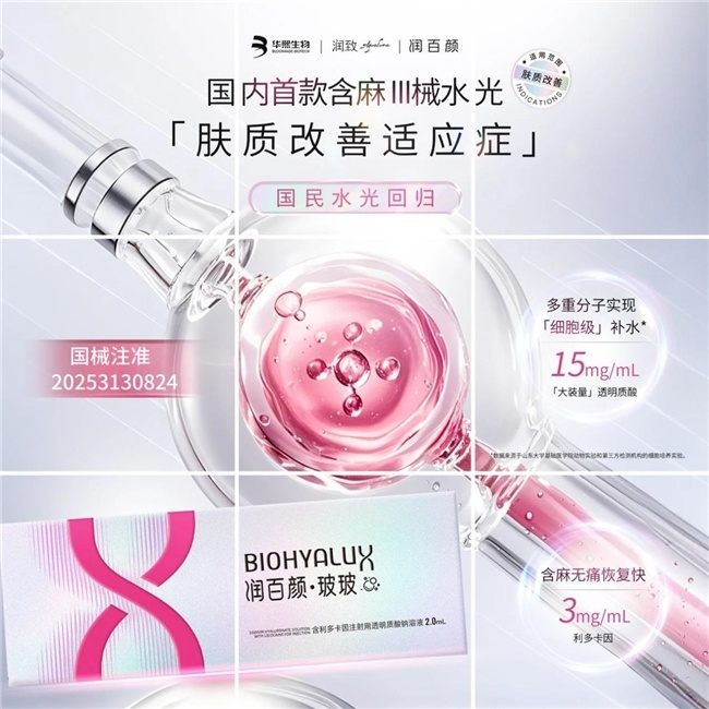 2025年4月25日,华熙生物自主研发的含利多卡因注射用透明质酸钠溶液「润百颜・玻玻」获批Ⅲ类医疗器械证,这是国内首个获批“面部肤质改善适应症”的水光产品。该产品采用非交联透明质酸与0.3%利多卡因配方,临床数据显示治疗有效率为94%,效果可持续3个月以上。此次获批标志着此类产品监管趋严,提高了市场准入门槛,推动行业向规范化发展。这一突破不仅彰显了华熙生物在糖生物学与细胞外基质科学的深度融合,更将实验室的科研成果转化为触手可及的抗衰解决方案。