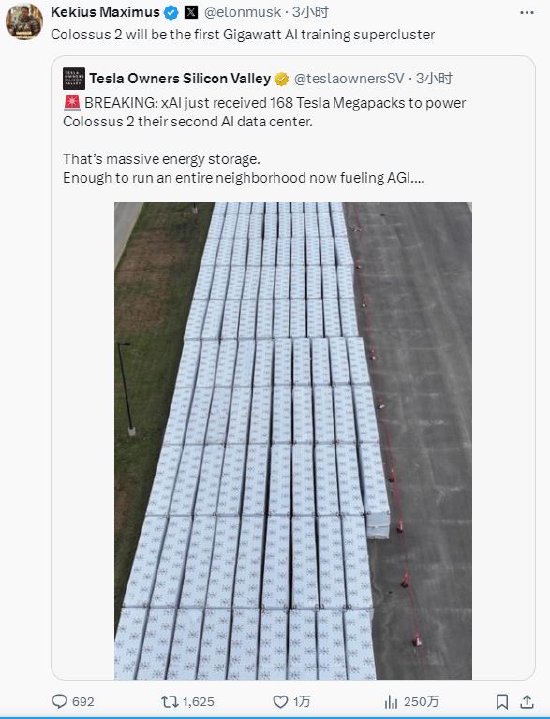 埃隆·马斯克最近强调,Colossus 2将是第一个吉瓦级的人工智能训练超级集群,他在分享一篇详细介绍部署168个特斯拉Megapacks为这个新数据中心供电的帖子时,强调了xAI日益增长的基础设施野心。