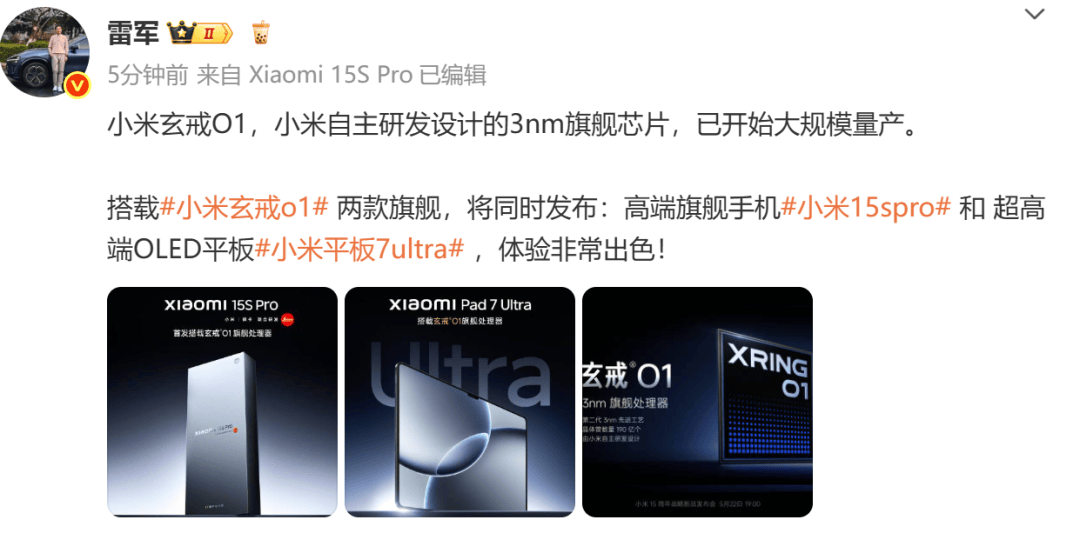 5月20日上午,小米集团董事长兼CEO雷军在其微博宣布:“小米玄戒O1,小米自主研发设计的3nm旗舰芯片,已开始大规模量产。”