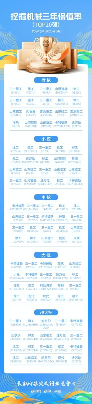 (行业首发挖掘机械三年保值率榜单Top20强机型)