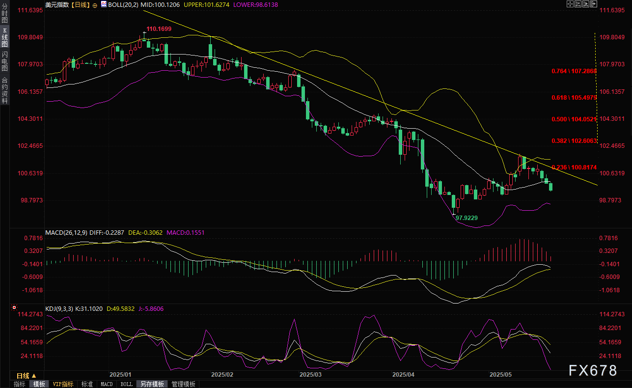 汇通财经APP讯――全球外汇市场正经历着惊心动魄的波动浪潮。周三(5月21日)交易时段,美元指数延续跌势至99.42关口,创下自5月7日以来的三周最低点,单日跌幅高达0.58%。虽然尾盘略有回升至99.55附近,但这已是美元连续第三日呈现颓势。市场观察人士指出,这场美元危机的导火索,直接指向华盛顿政治圈的一场关键博弈――特朗普总统力推的全面减税法案在共和党内部遭遇顽固派阻击,这场立法僵局正在动摇全球投资者对美元资产的信心。