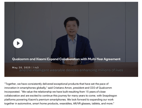 新浪科技讯 5月21日下午消息,美国高通公司在官网发布新闻稿称,该公司与小米公司庆祝合作15周年,并签署了一份多年期协议。在官方新闻中,雷军录制了一段视频,祝贺高通公司成立40周年,并表示“高通一直引领前沿技术创新,始终是我们坚定的合作伙伴。”