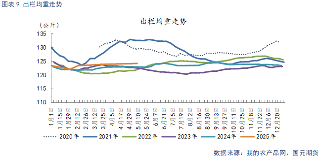 截止5月19日,生猪出栏均重124.12公斤,较上周持平。当前出栏均重处于近四年高位,单头生猪提供的肉量增加,随着气温不断升高,养殖端加快大猪出栏速度,供给端面临量重双高的局面。??
