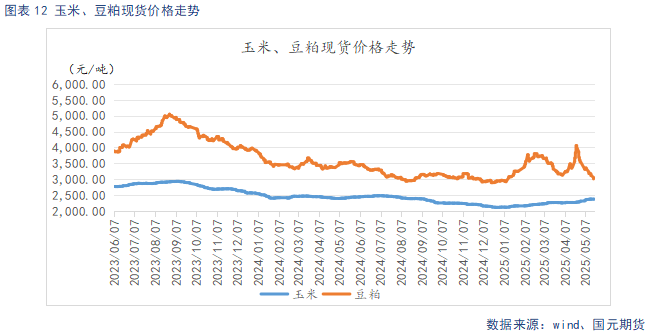 截止5月20日,玉米现货均价2375.2元/吨,较上周环比上涨1.87元/吨,豆粕现货均价3011.14元/吨,较上周环比下跌161.72元/吨。近期玉米价格小幅上行,豆粕价格持续回落,饲料原料价格整体走弱。玉米从基本面看,进口锐减使市场更依赖国内粮源。粮源集中在贸易环节,流通压力加大。华北新麦上市在即,小麦替代优势显现。深加工需求疲软,玉米上方压力较大。??豆粕从基本面看,尽管4月巴西大豆供应逐步恢复,但运输周期导致1-4月国内进口量仍低于往年。当前因油厂开机恢复初期压车严重,部分限量停单,供应恢复偏慢。不过,下游饲料企业提货积极,养殖需求稳健对现货价格形成支撑,短期豆粕预计趋稳运行。