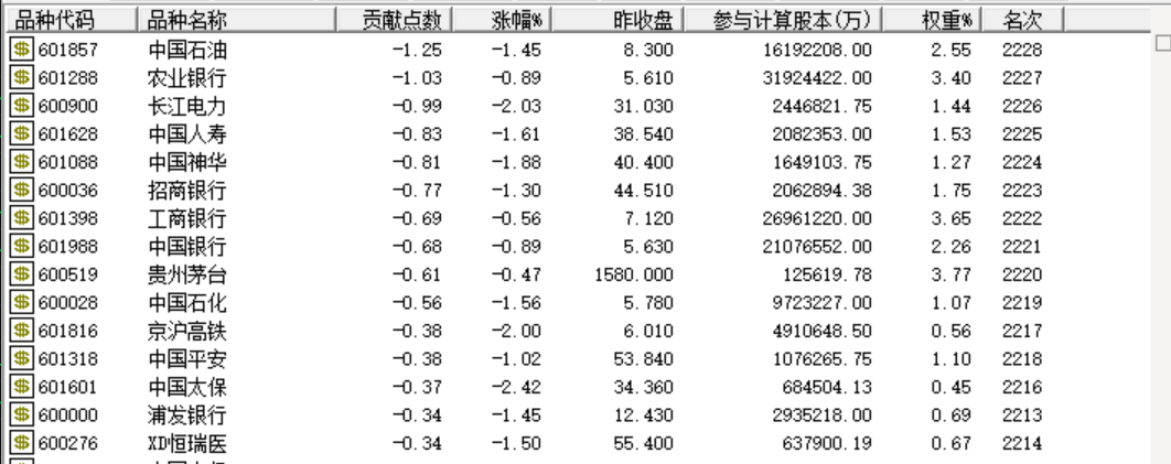 从结构上看,大盘蓝筹股是下跌的主力,今天早上长江电力(600900)就带头下跌,盘中跌幅扩大至2%,中国平安(601318)、中信证券(600030)、贵州茅台(600519)等多只权重股短线跳水,中国石油(601857)、农业银行(601288)、中国人寿(601628)等股票更是贡献了较大的下跌点数,上证指数跌幅也跟随扩大。