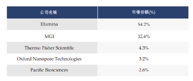 从竞争格局看,全球高通量基因测序仪器及耗材市场已呈现高度集中态势,目前由少数跨国生物科技公司主导。于2023年,按该年的收入计,前五大市场参与者合共占据96.2%的市场份额,其中Illumina单一企业即占有72.1%的显著份额。