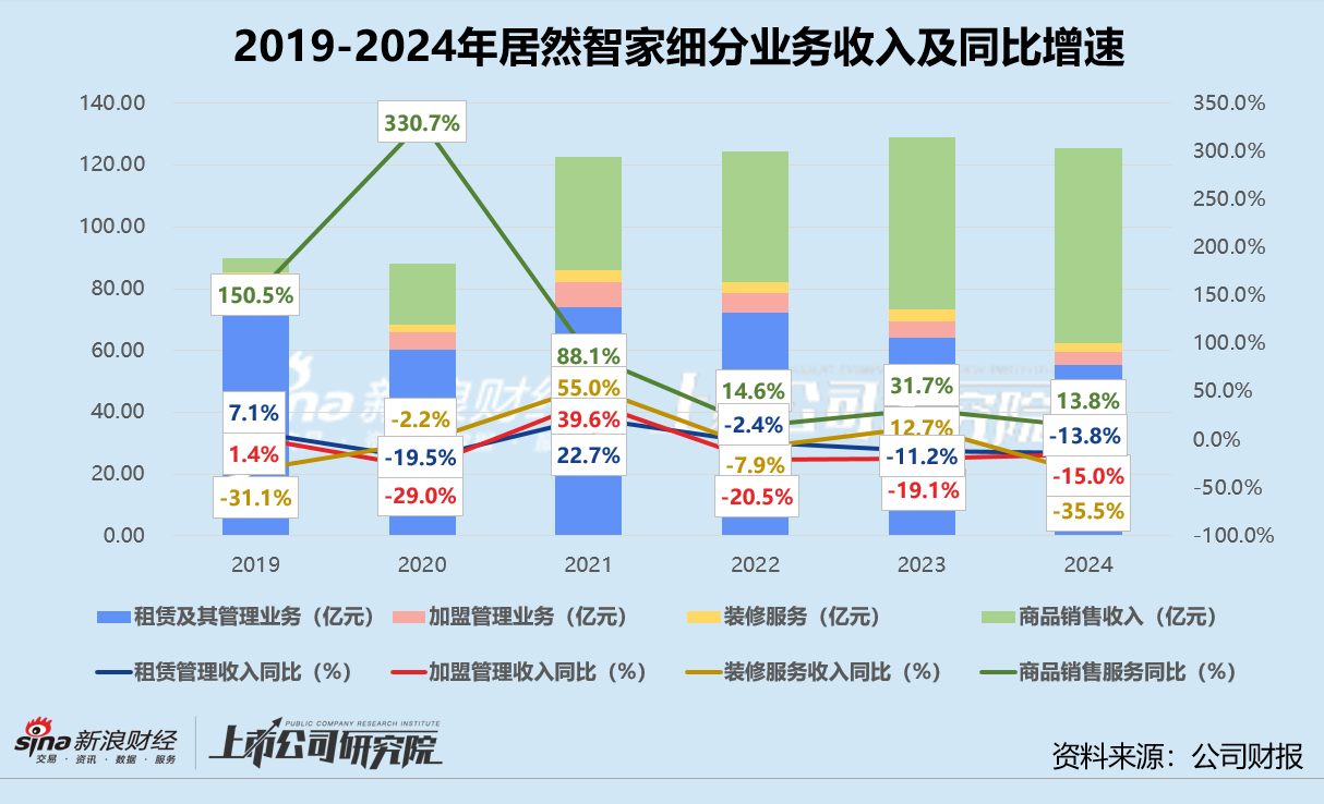就细分业务而言,报告期内,居然智家面向商户的租赁及管理收入首次降至60亿元以下,对总营收约贡献42.7%,与2019年的82.3%占比相去甚远;加盟管理收入较2023年减少15.0%至4.33亿元,装修服务收入则同比锐减35.5%至2.63亿元,两项业务合计占总营收比例低至5.3%。