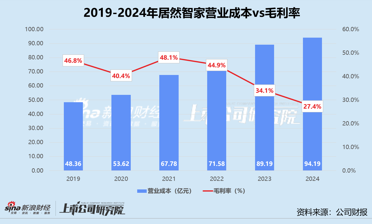 2024年,居然智家的营业成本同比微增5.6%,录得94.19亿元。其中,卖场业务相关的租赁及管理业务、加盟管理业务和装修服务营业成本较2023年分别下降5.4%、6.5%、43.8%,前两项业务的成本降幅低于收入降幅;商品销售成本随着规模扩大增长16.7%,占营业成本比重超62%,高于同期业务收入增速。