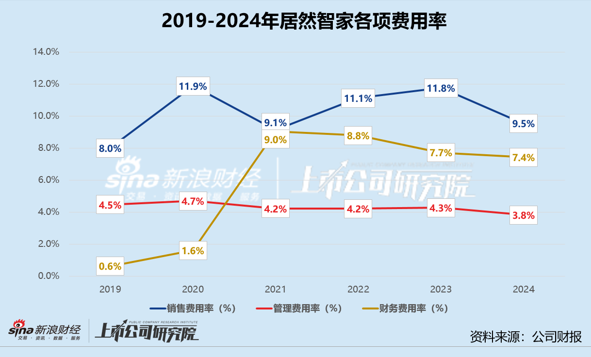 受家居卖场空置率上升、加盟招商分成收入缩减及租赁物业成本刚性影响,报告期内居然智家的综合毛利率承压,同比减少6.8个百分点至27.4%。2021-2024年,公司毛利率三连降,从最高点48.1%跌至27.4%。