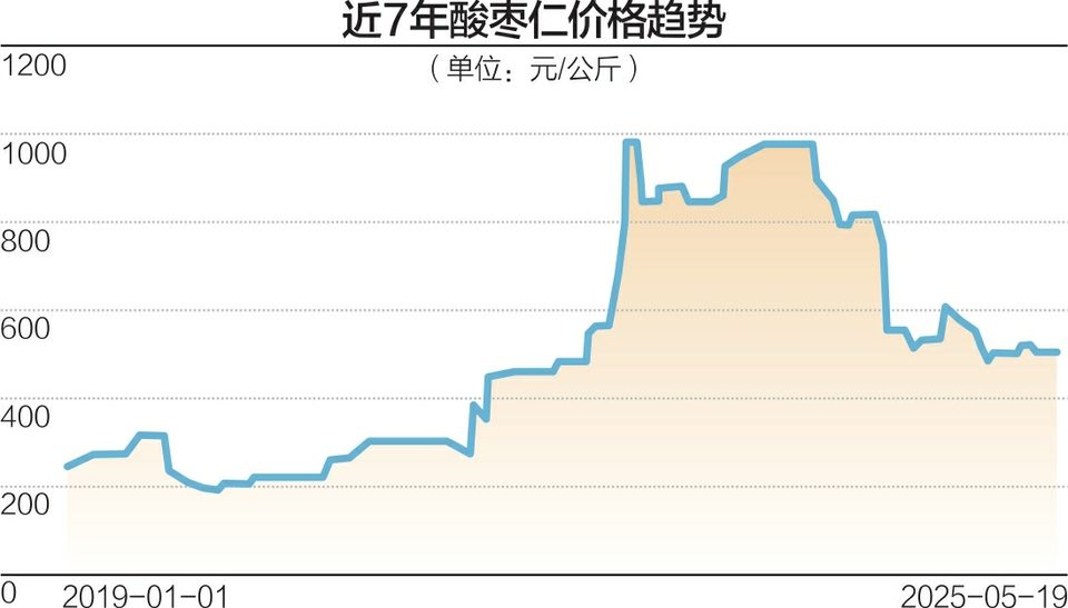 “血雨腥风!”谈到酸枣仁最近几年的价格波动,一家中药企业采购销售负责人张阳(化名)这样形容。他分析称,出现2020年~2023年这个上涨周期,是因为需求激增,叠加野生资源稀缺、资本涌入,推动酸枣仁价格从每公斤200元飙升至千元以上。彼时,“抢青”现象严重,导致产量与质量双降,市场炒作氛围浓厚,加工户普遍以每公斤约900元成本囤货。